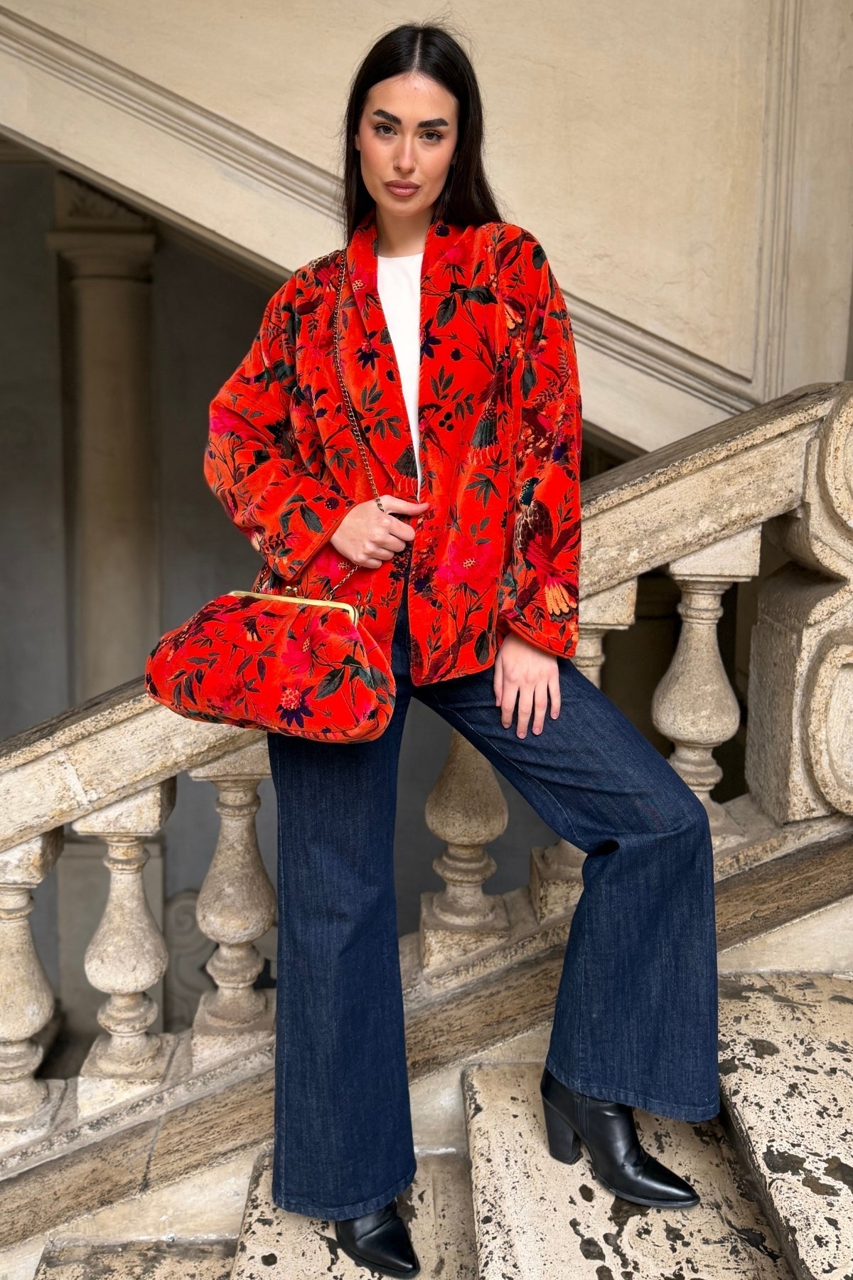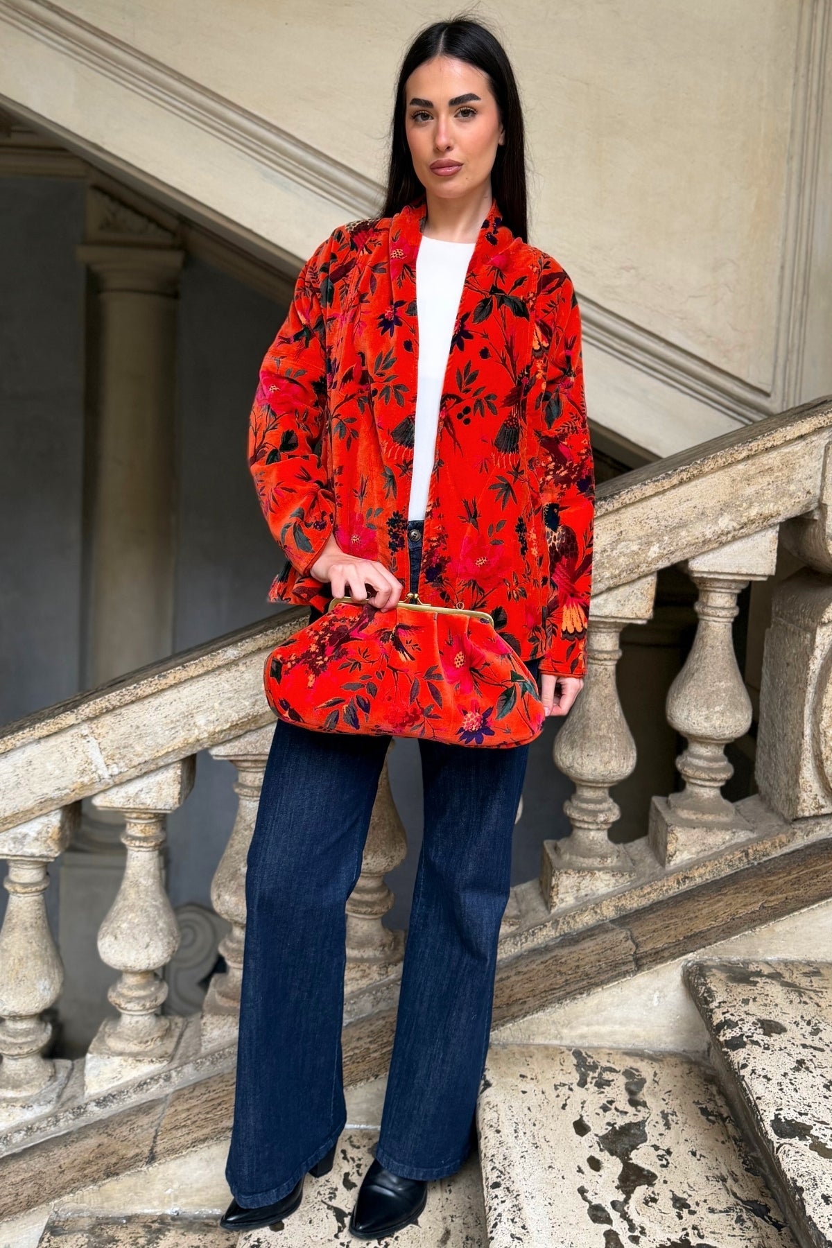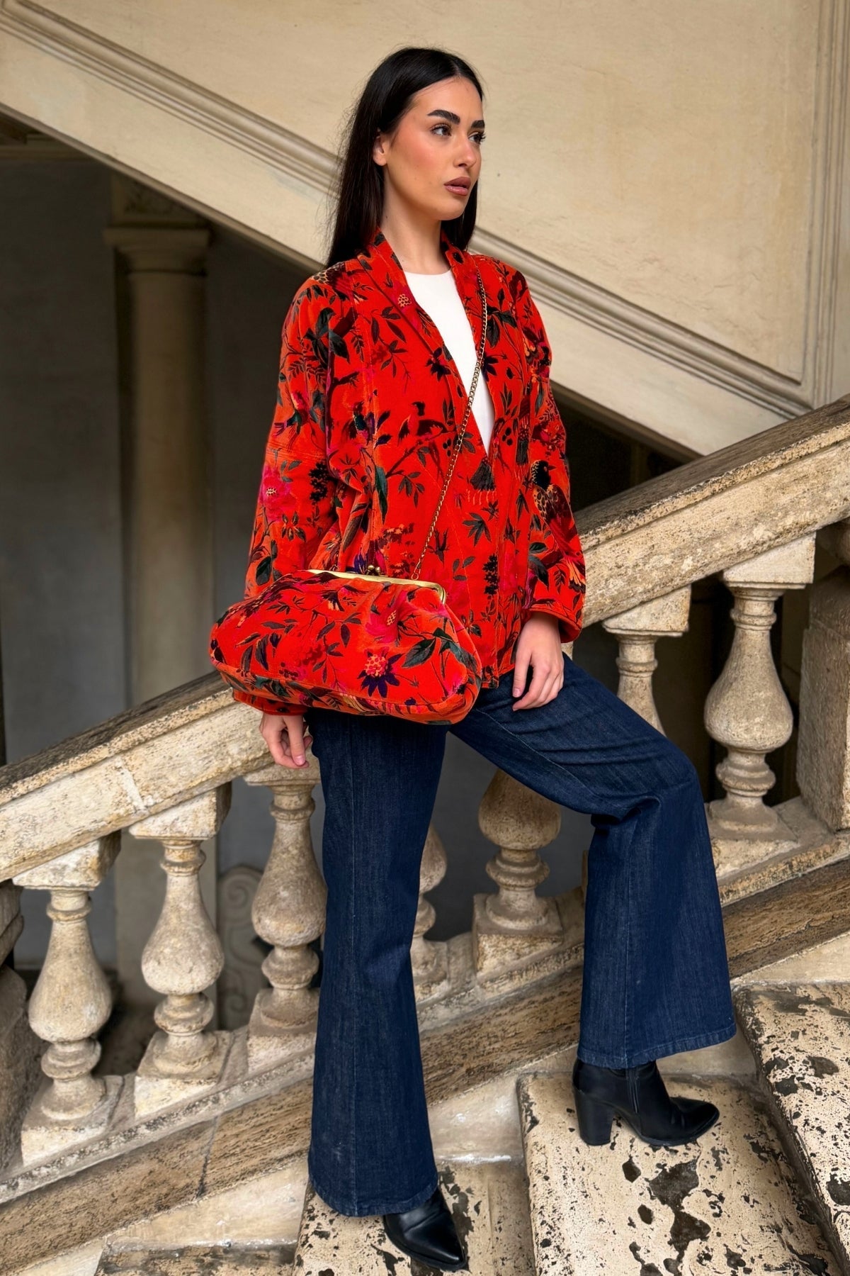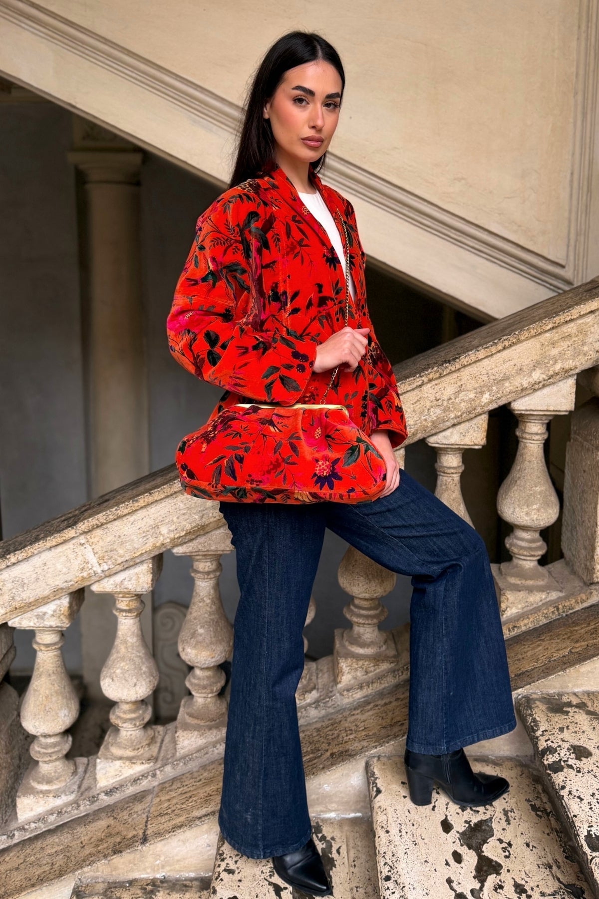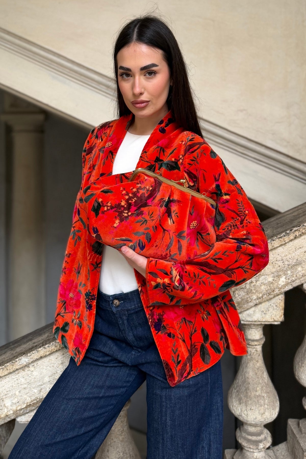 La borsetta Stella in velluto di cotone stampato a mano reinterpreta il classico taglio “pasticcino” con un’allure decisa e sofisticata. La texture vellutata incontra fantasie esclusive, trasformando questo modello in un piccolo gioiello da portare sempre con sé.