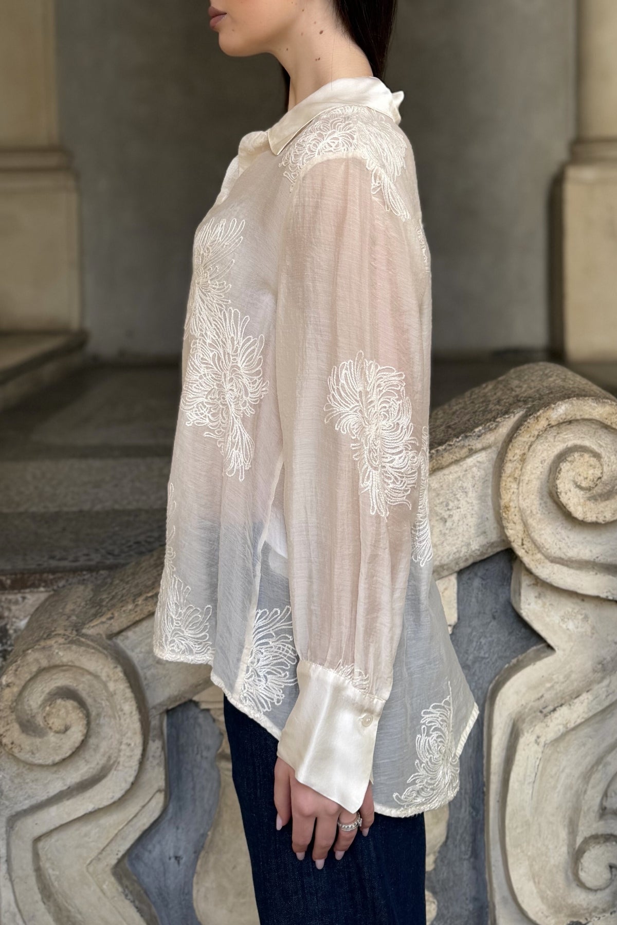 Camicia leggera e raffinata, realizzata in tessuto fluido impreziosito da ricami floreali tono su tono che creano un delicato gioco di texture sulla superficie. Il motivo ricamato emerge con eleganza, donando profondità e carattere al capo mantenendo una grande leggerezza visiva.