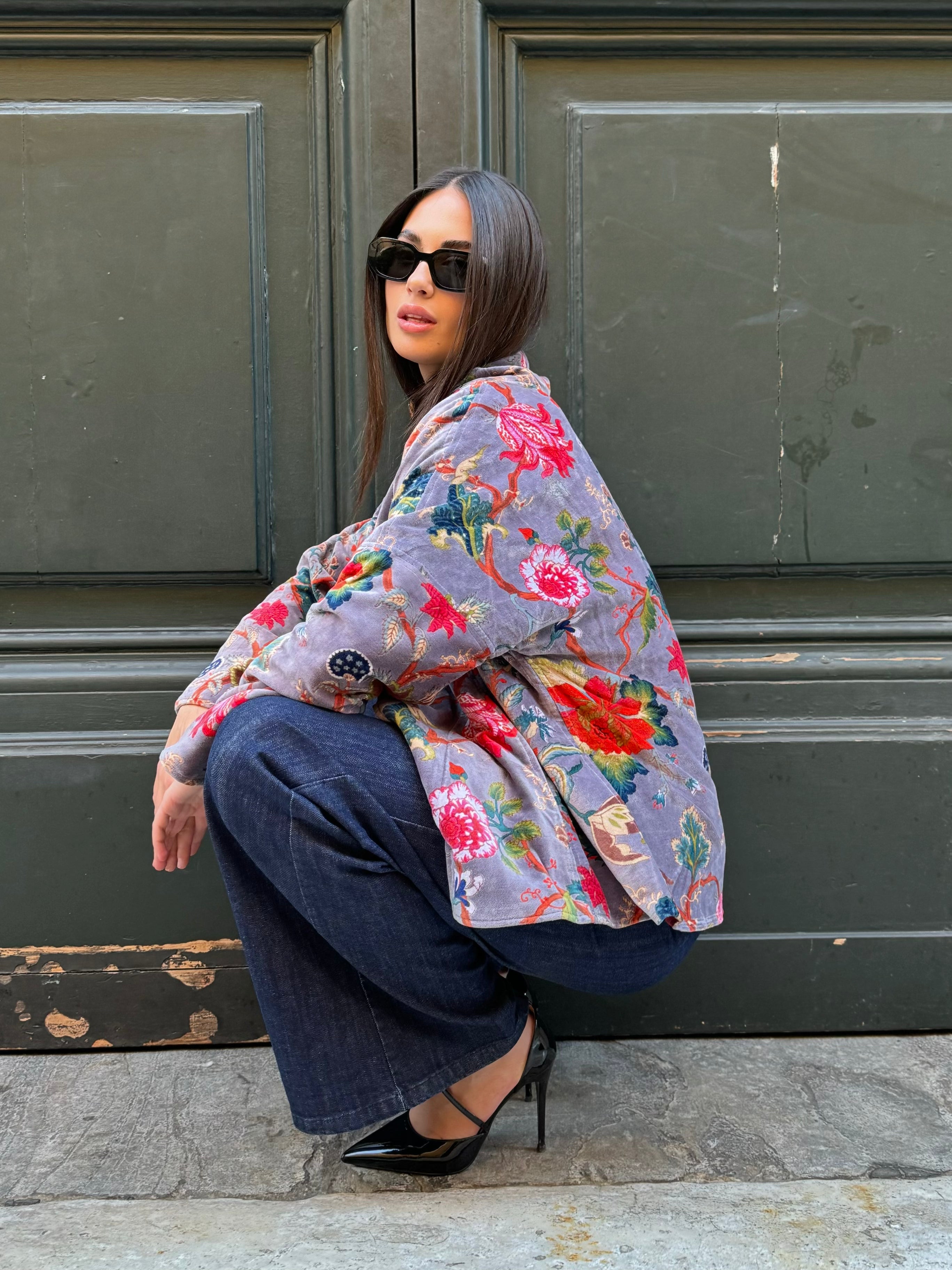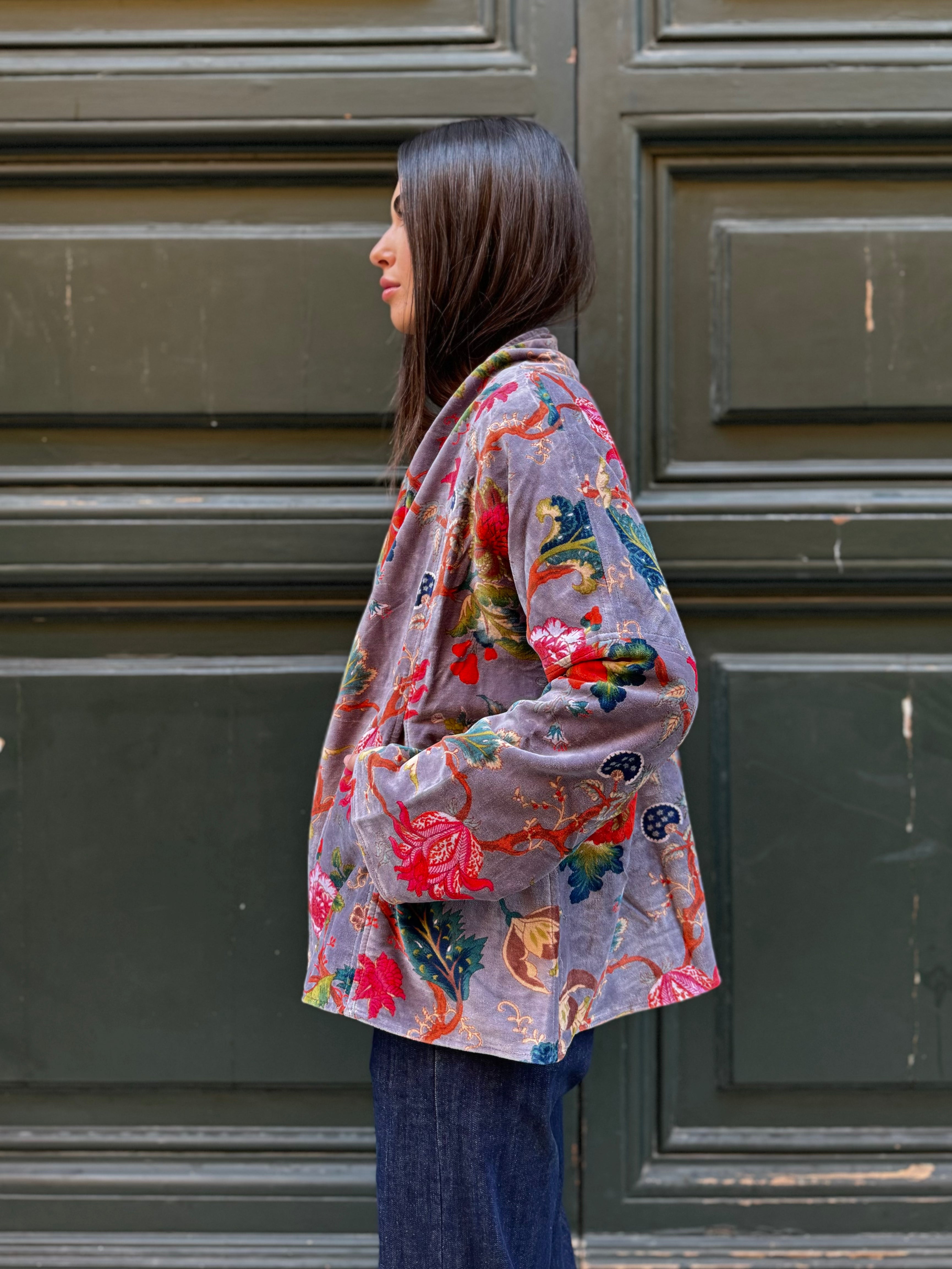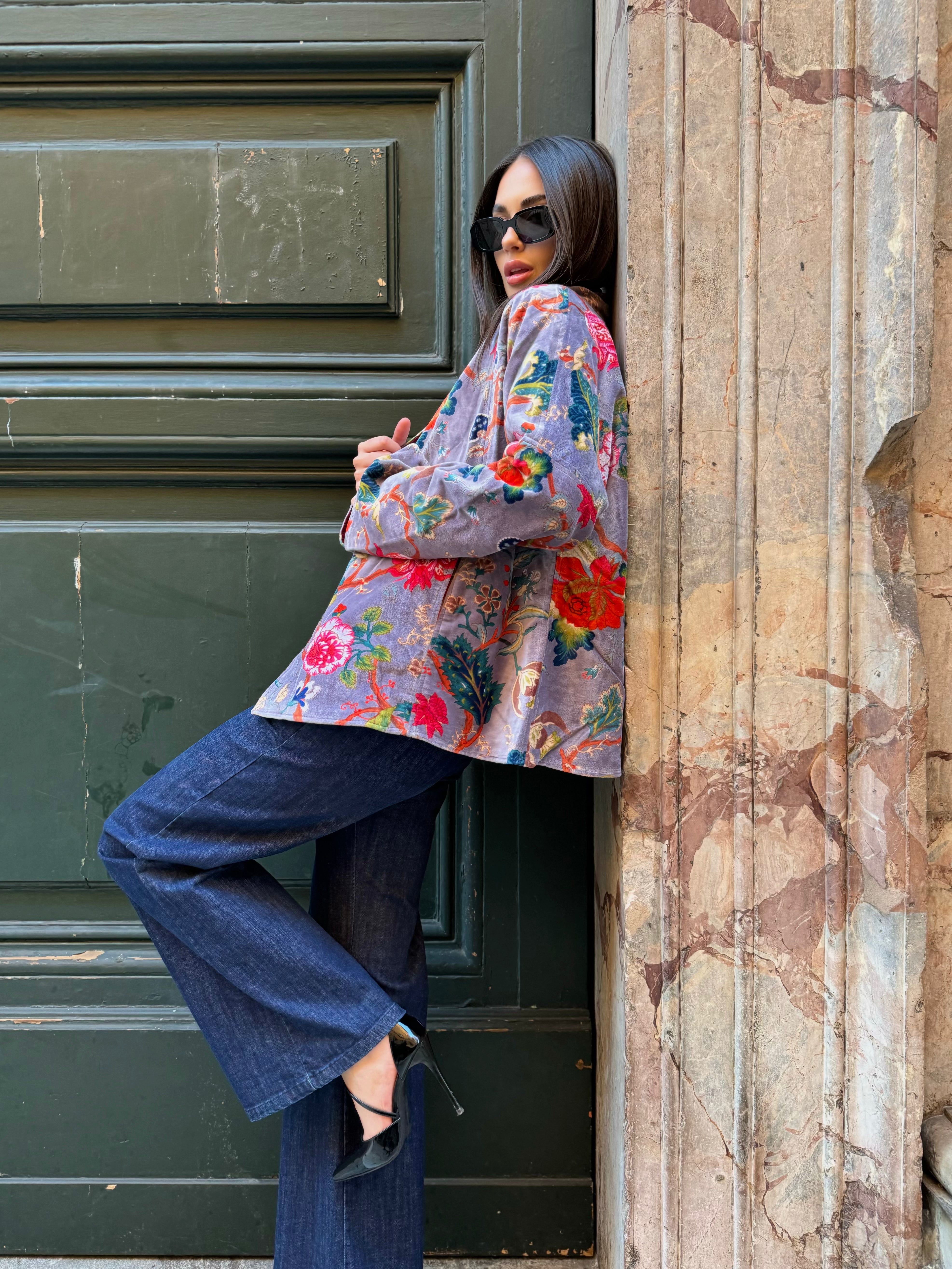 Il taglio a trapezio, studiato per donare struttura e carattere ad ogni look e per adattarsi armoniosamente a ogni tipo di fisico, dialoga con la morbidezza del velluto di cotone stampato a mano, rendendo ogni giacca un pezzo unico.