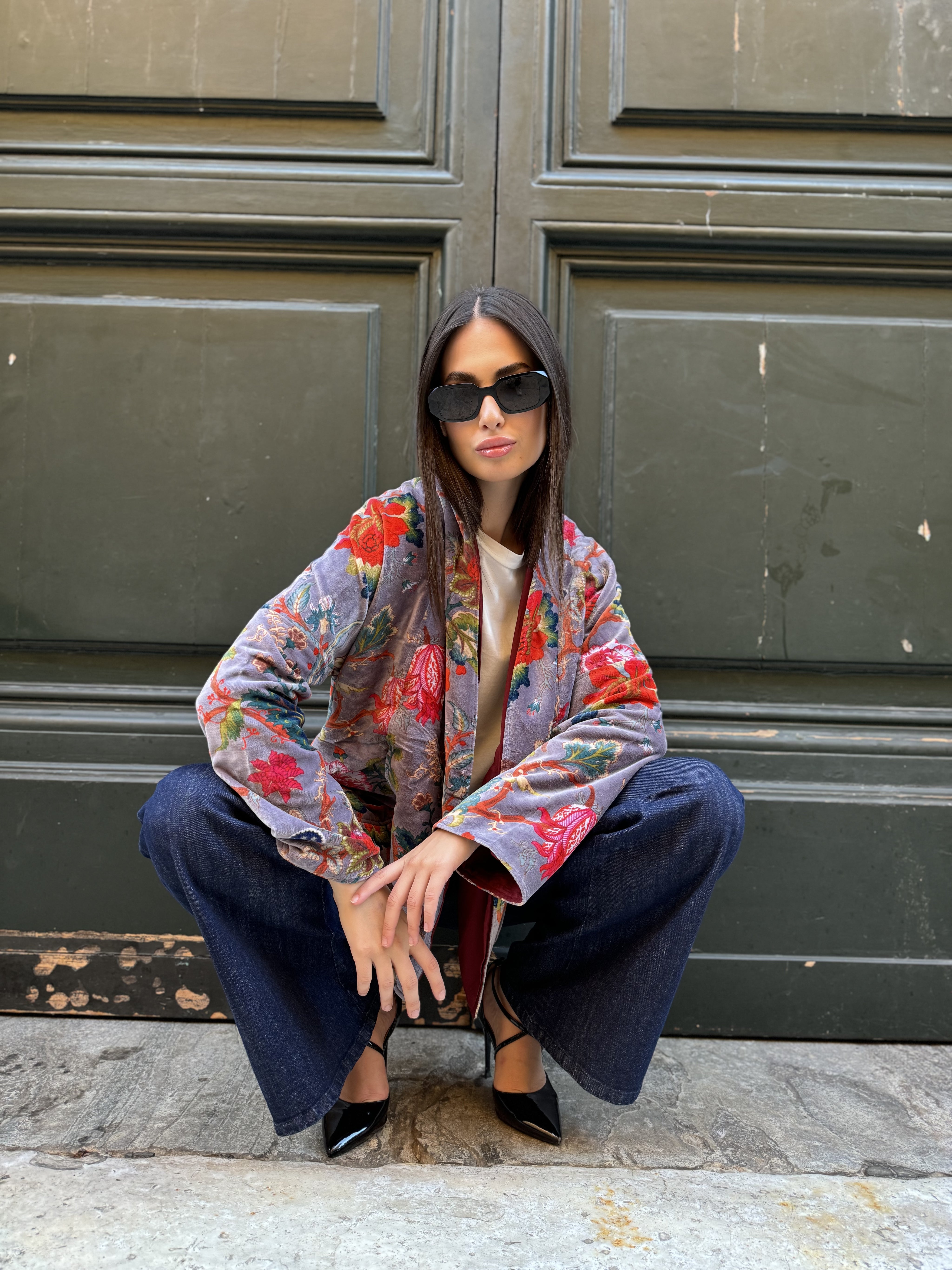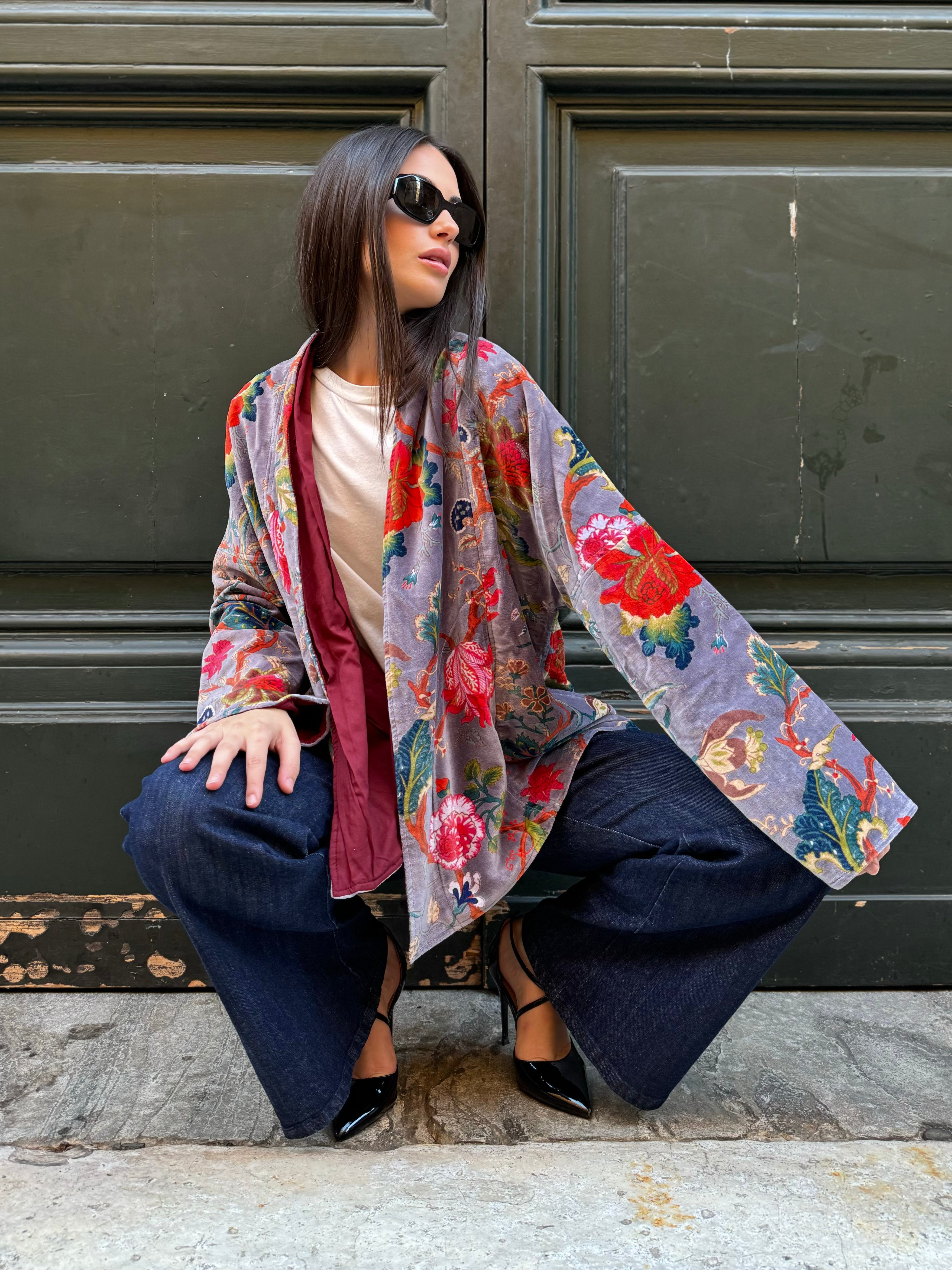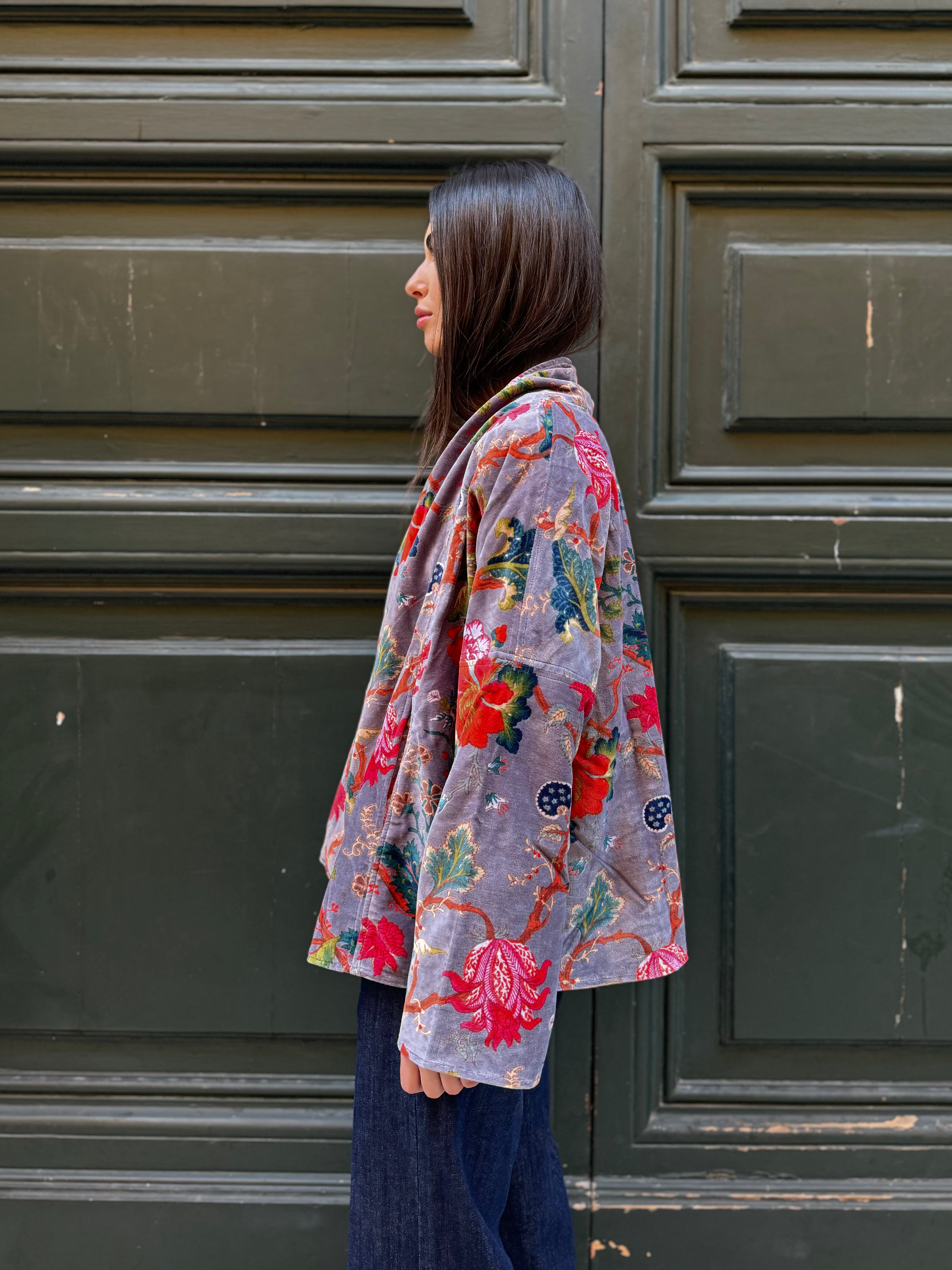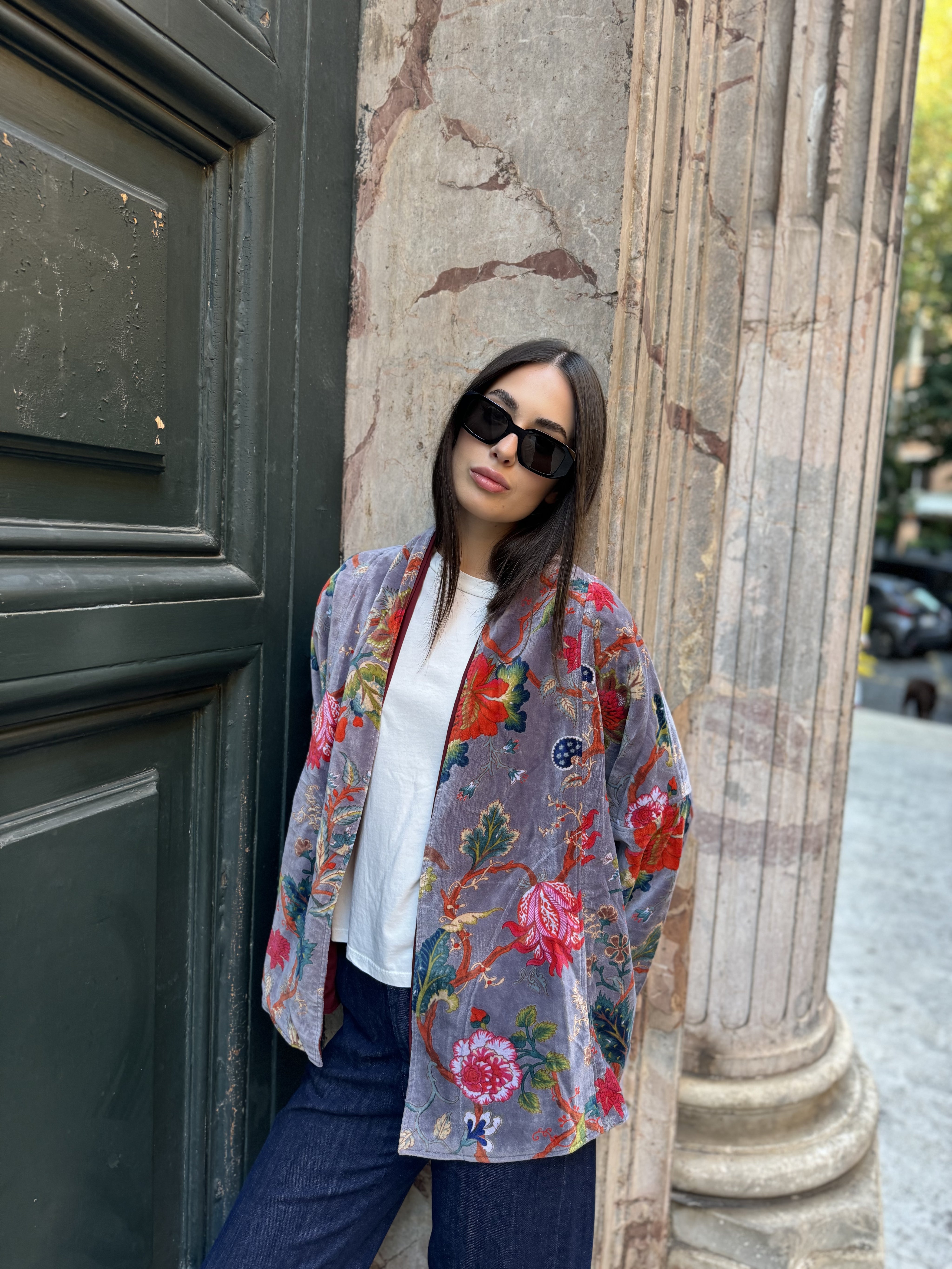 Il taglio a trapezio, studiato per donare struttura e carattere ad ogni look e per adattarsi armoniosamente a ogni tipo di fisico, dialoga con la morbidezza del velluto di cotone stampato a mano, rendendo ogni giacca un pezzo unico.