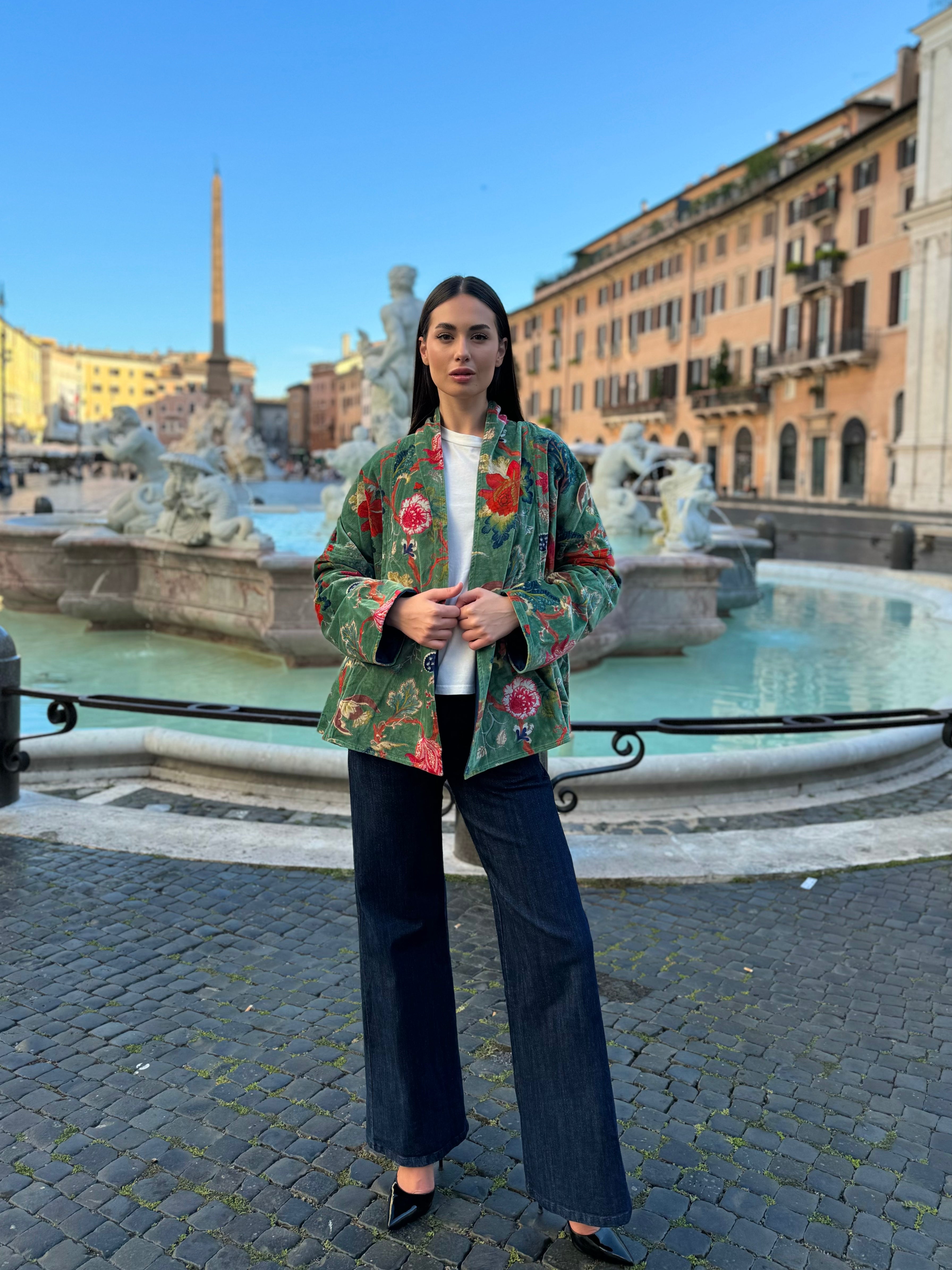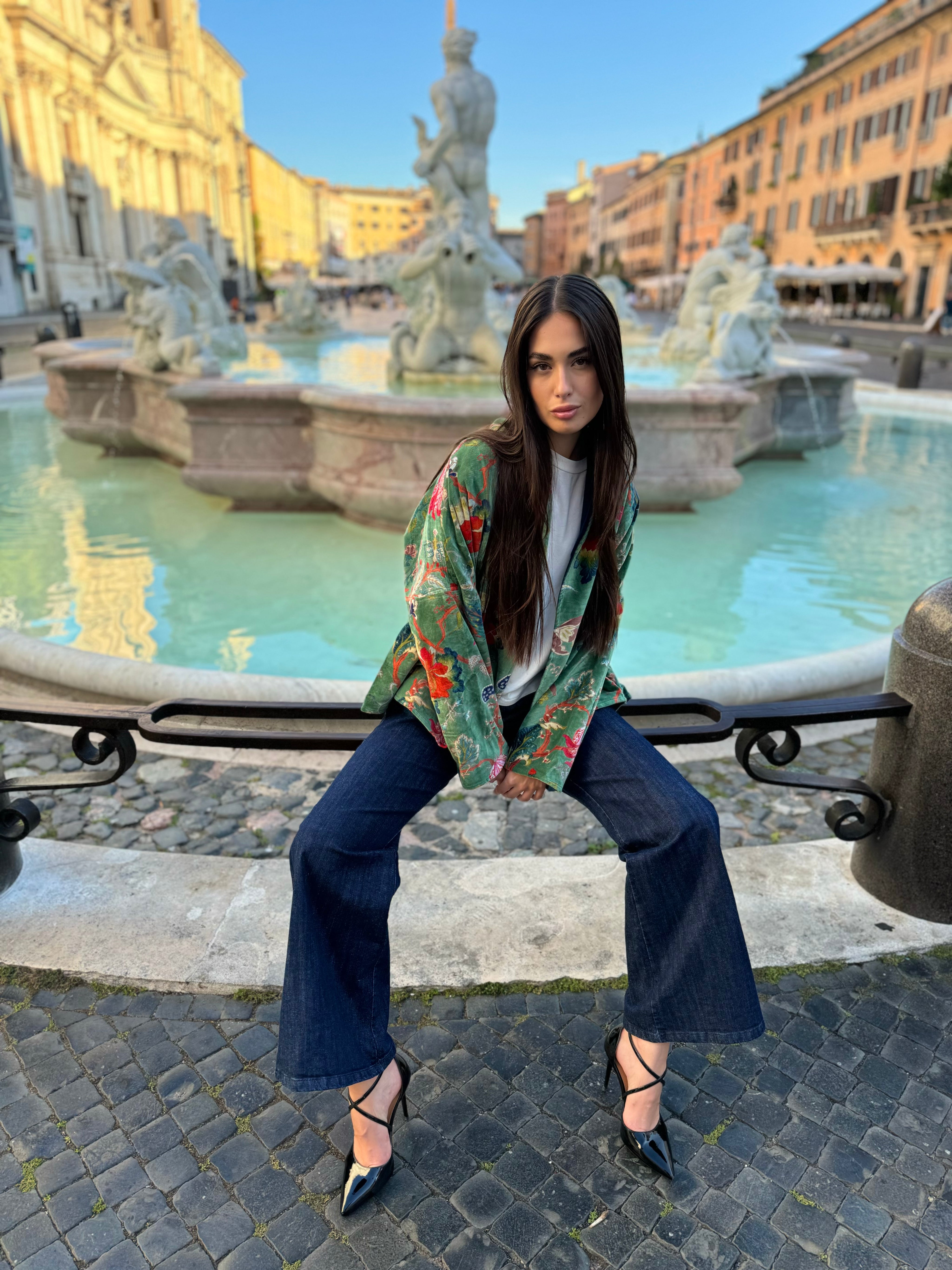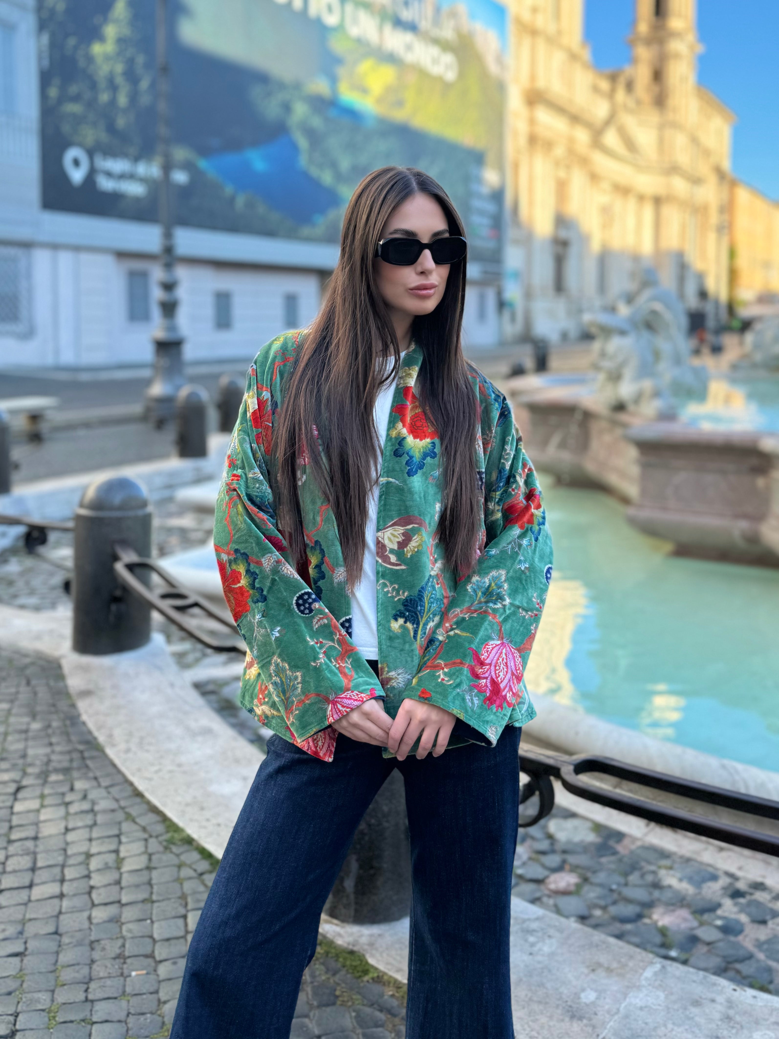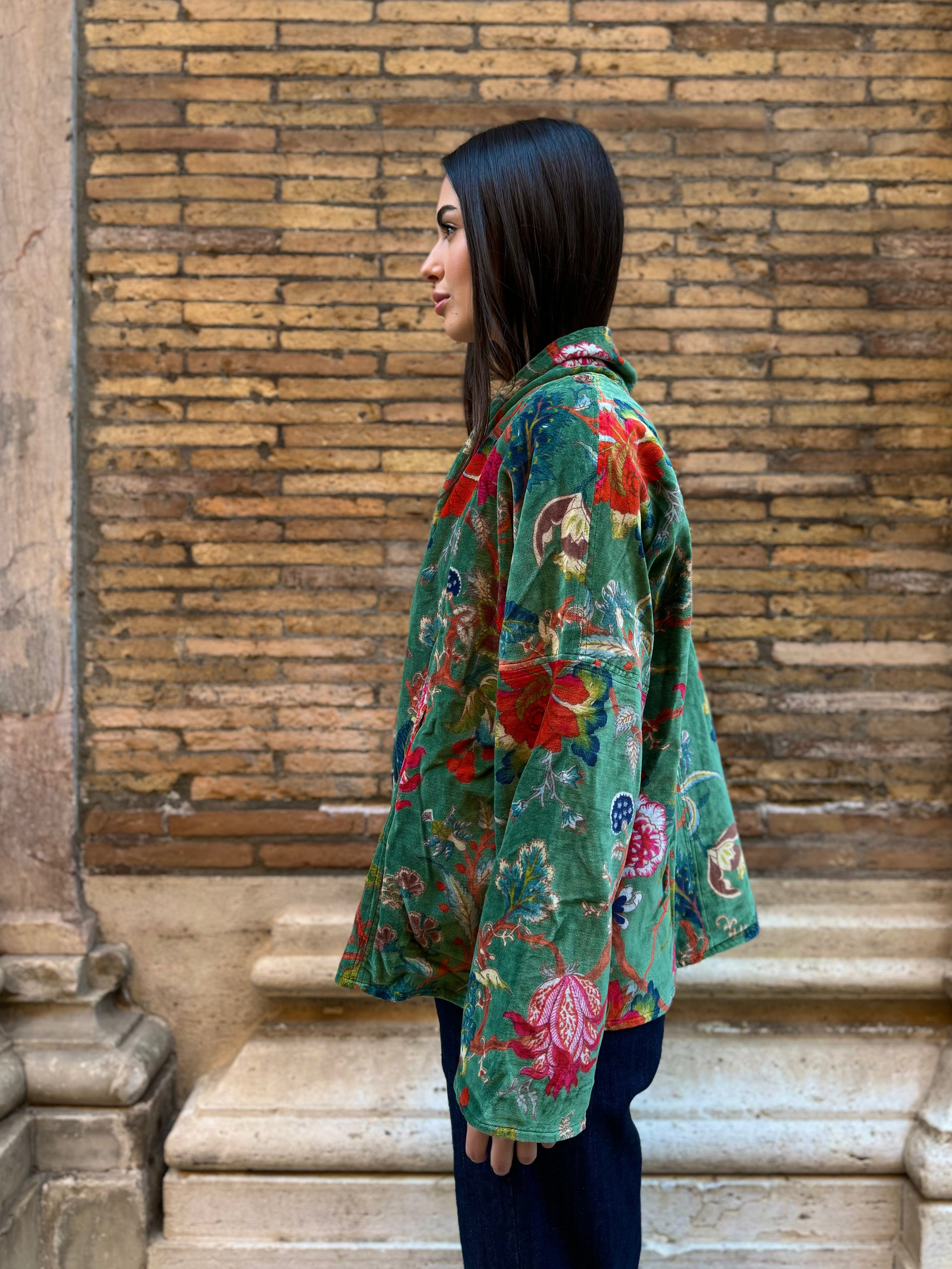 Il taglio a trapezio, studiato per donare struttura e carattere ad ogni look e per adattarsi armoniosamente a ogni tipo di fisico, dialoga con la morbidezza del velluto di cotone stampato a mano, rendendo ogni giacca un pezzo unico.