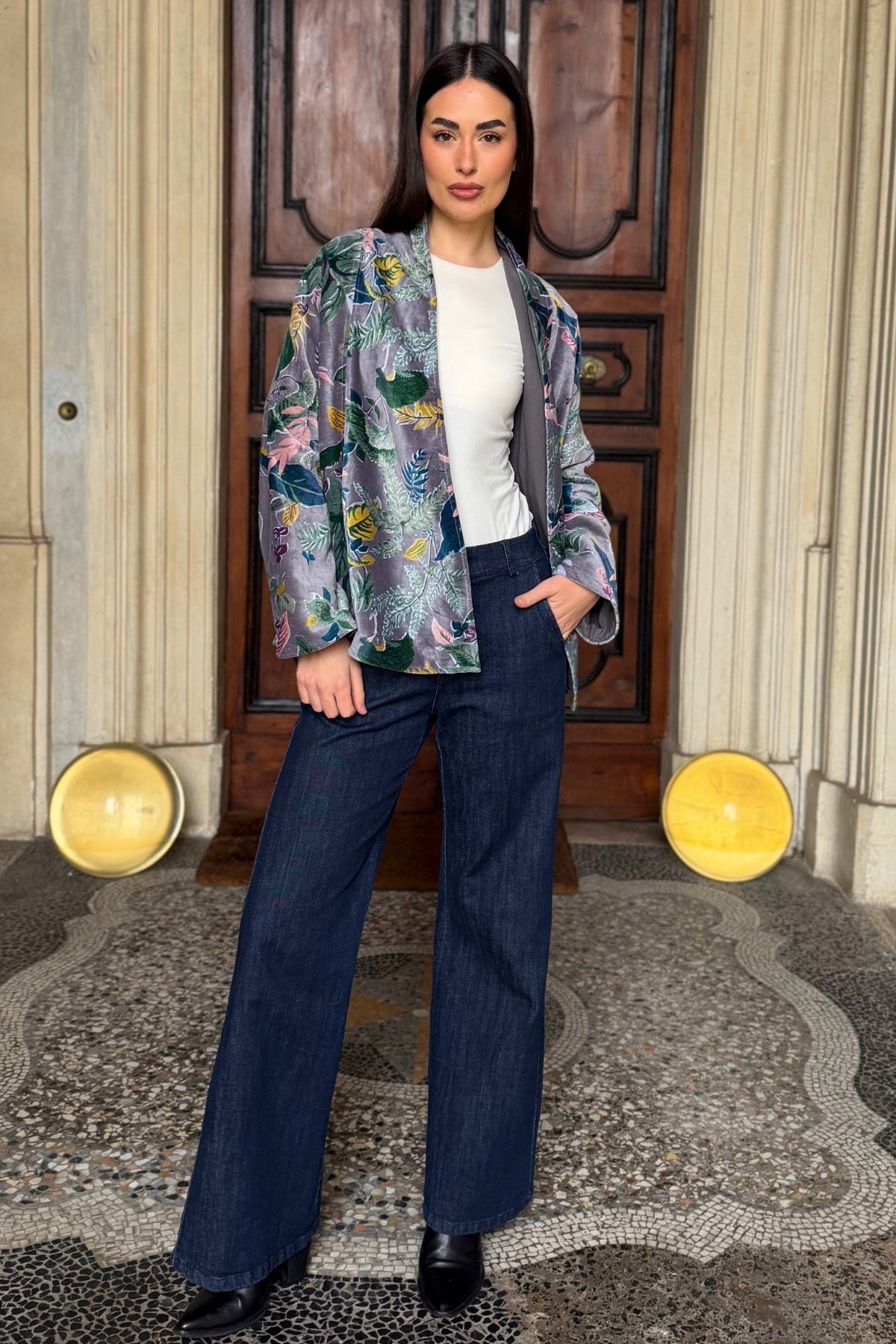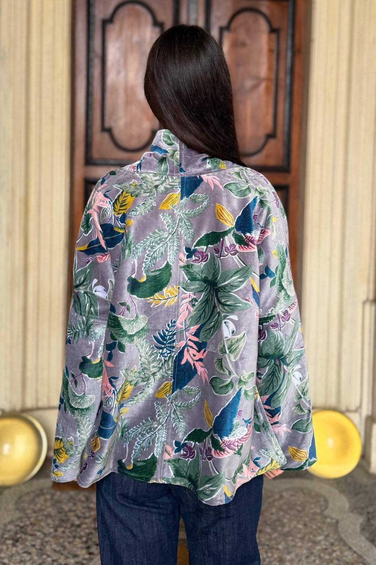 Il taglio a trapezio, studiato per donare struttura e carattere ad ogni look e per adattarsi armoniosamente a ogni tipo di fisico, dialoga con la morbidezza del velluto di cotone stampato a mano, rendendo ogni giacca un pezzo unico.